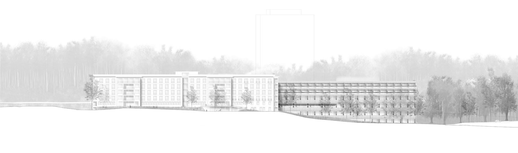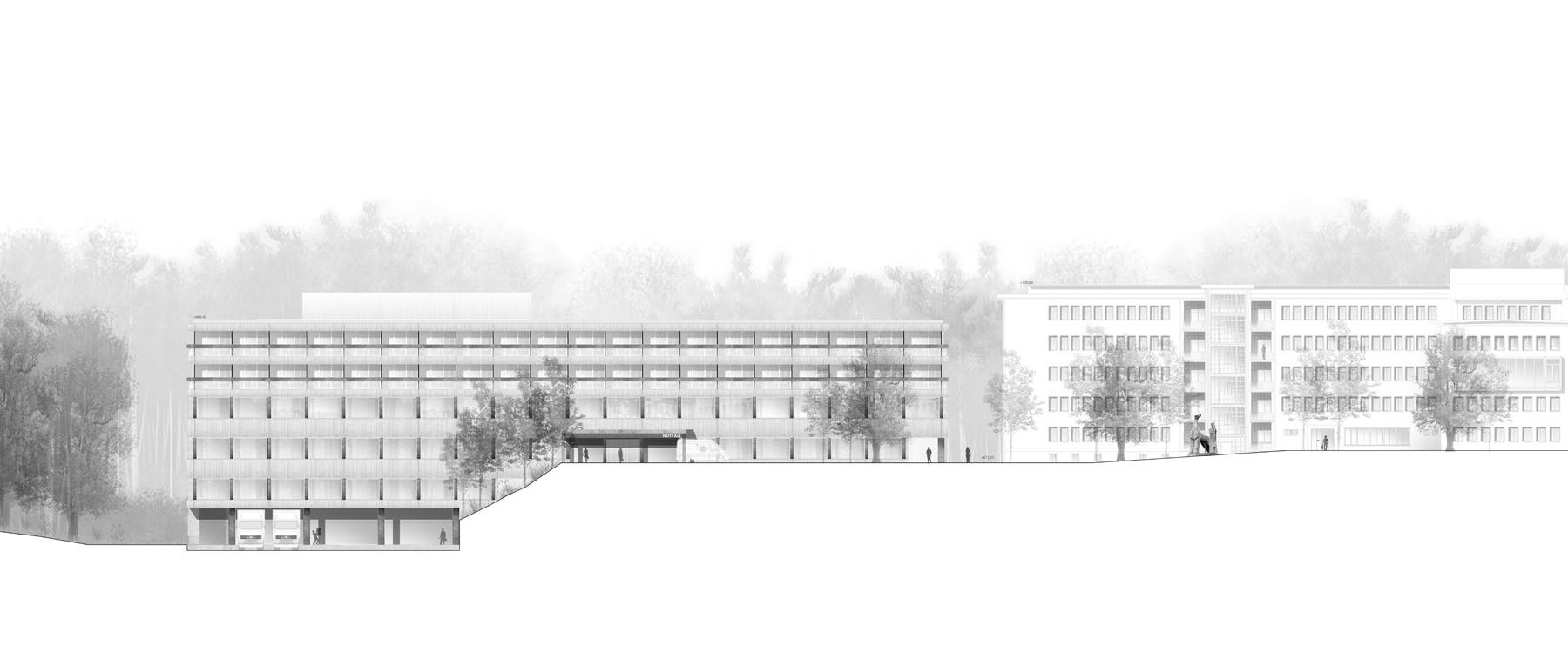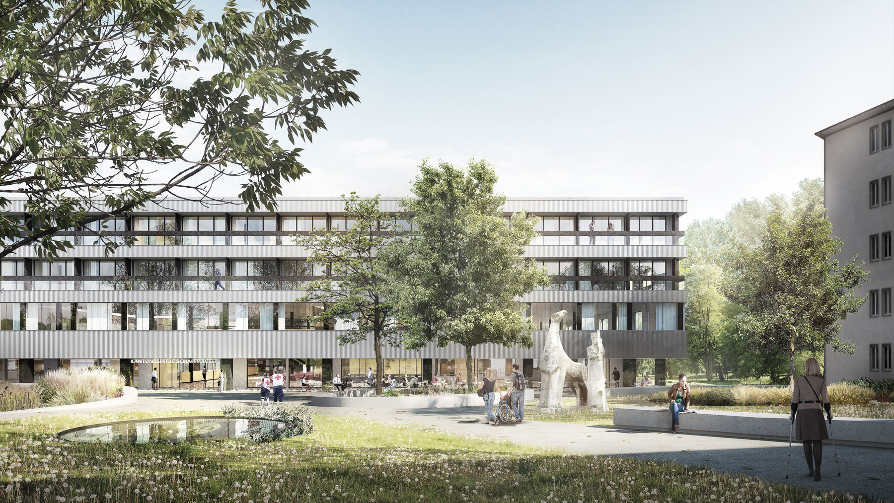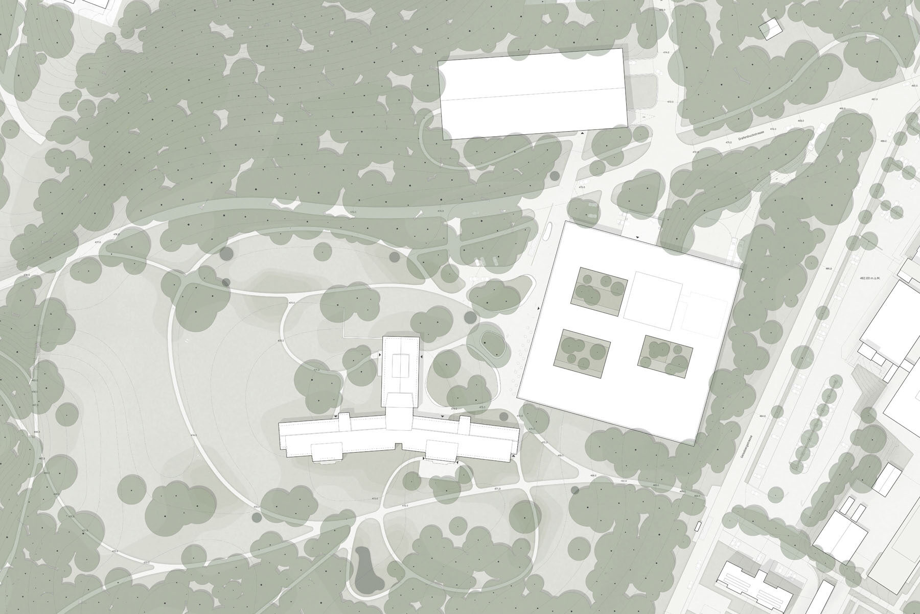 Im Süden bildet das neue Volumen zusammen mit dem historischen Bestandsbau eine Parkfassade aus. Um dem Altbau seine Kraft als Solitär im Park zurückzugeben wird der Neubau – ebenfalls ein Solitär – zurückgesetzt und als niedrigeres Volumen geplant. Zwischen den beiden Gebäuden führt ein Weg vom Park zum neuen Vorplatz und zum Haupteingang. Im Norden und Osten des neuen Spitals, in den Zwischenzonen zwischen Geissberg- und Grafenbuckstrasse, bleibt der charakteristische Wald bestehen. So wird eine spannende Wechselbeziehung zwischen dem neuen Gebäude und dem bestehenden Baumvolumen etabliert.