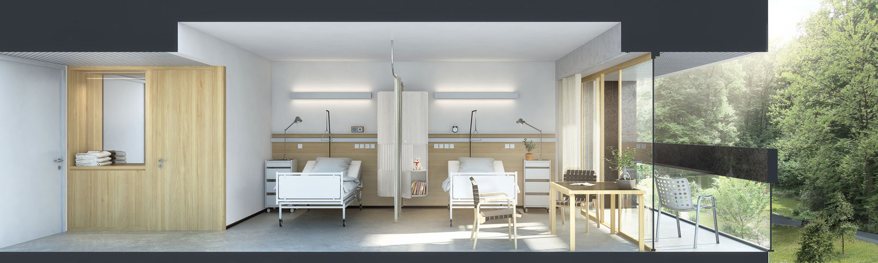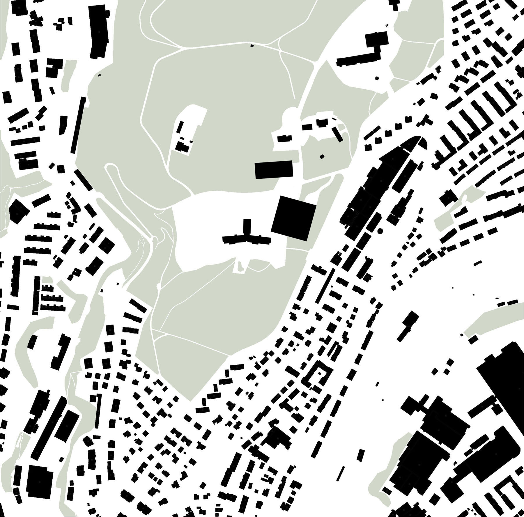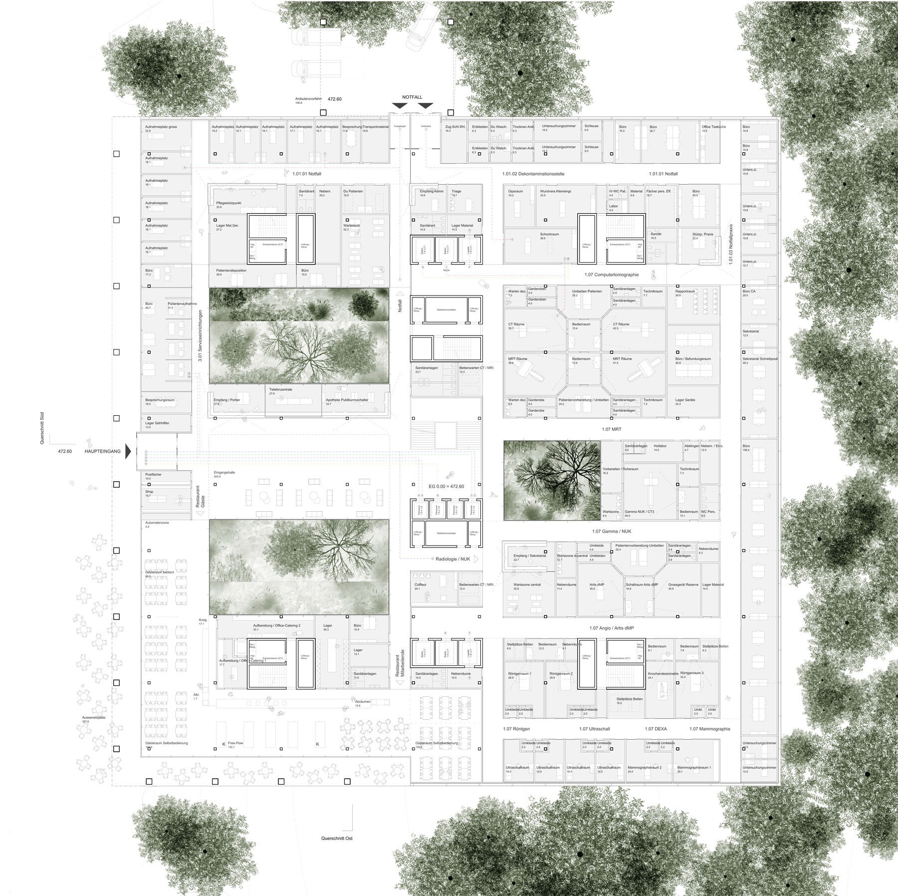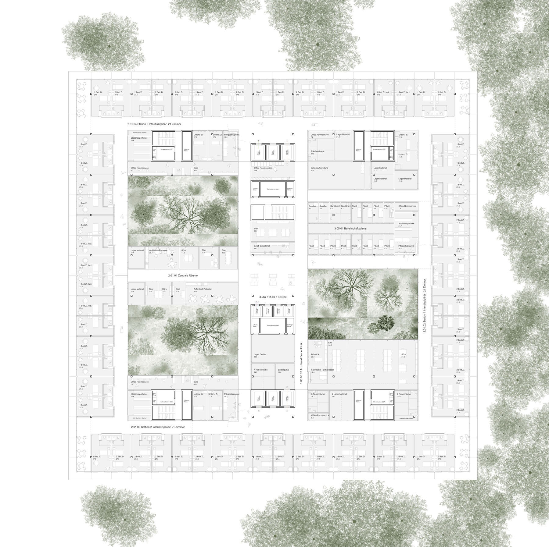 Im Süden bildet das neue Volumen zusammen mit dem historischen Bestandsbau eine Parkfassade aus. Um dem Altbau seine Kraft als Solitär im Park zurückzugeben wird der Neubau – ebenfalls ein Solitär – zurückgesetzt und als niedrigeres Volumen geplant. Zwischen den beiden Gebäuden führt ein Weg vom Park zum neuen Vorplatz und zum Haupteingang. Im Norden und Osten des neuen Spitals, in den Zwischenzonen zwischen Geissberg- und Grafenbuckstrasse, bleibt der charakteristische Wald bestehen. So wird eine spannende Wechselbeziehung zwischen dem neuen Gebäude und dem bestehenden Baumvolumen etabliert.