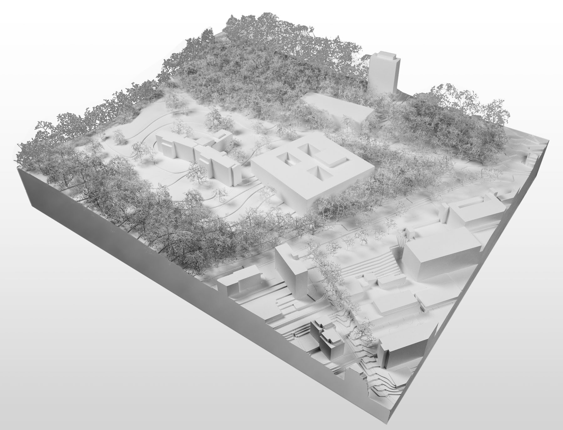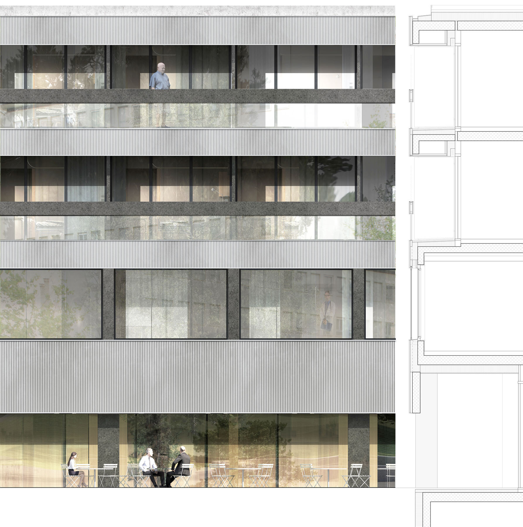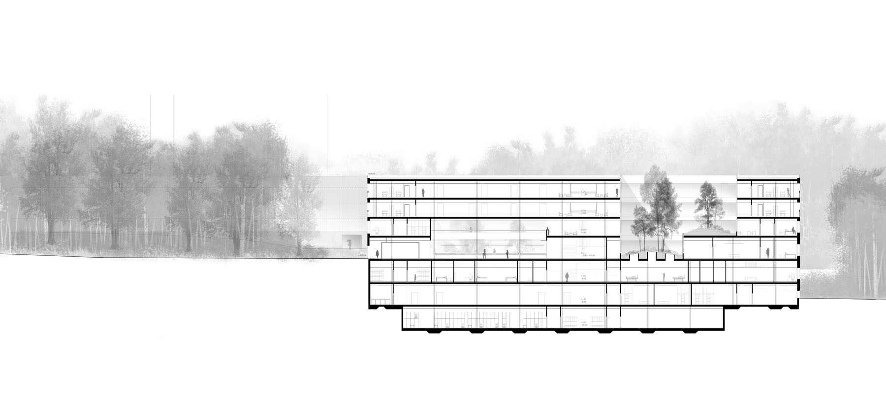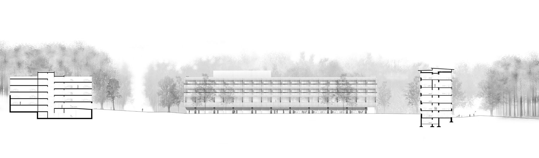 Im Süden bildet das neue Volumen zusammen mit dem historischen Bestandsbau eine Parkfassade aus. Um dem Altbau seine Kraft als Solitär im Park zurückzugeben wird der Neubau – ebenfalls ein Solitär – zurückgesetzt und als niedrigeres Volumen geplant. Zwischen den beiden Gebäuden führt ein Weg vom Park zum neuen Vorplatz und zum Haupteingang. Im Norden und Osten des neuen Spitals, in den Zwischenzonen zwischen Geissberg- und Grafenbuckstrasse, bleibt der charakteristische Wald bestehen. So wird eine spannende Wechselbeziehung zwischen dem neuen Gebäude und dem bestehenden Baumvolumen etabliert.
