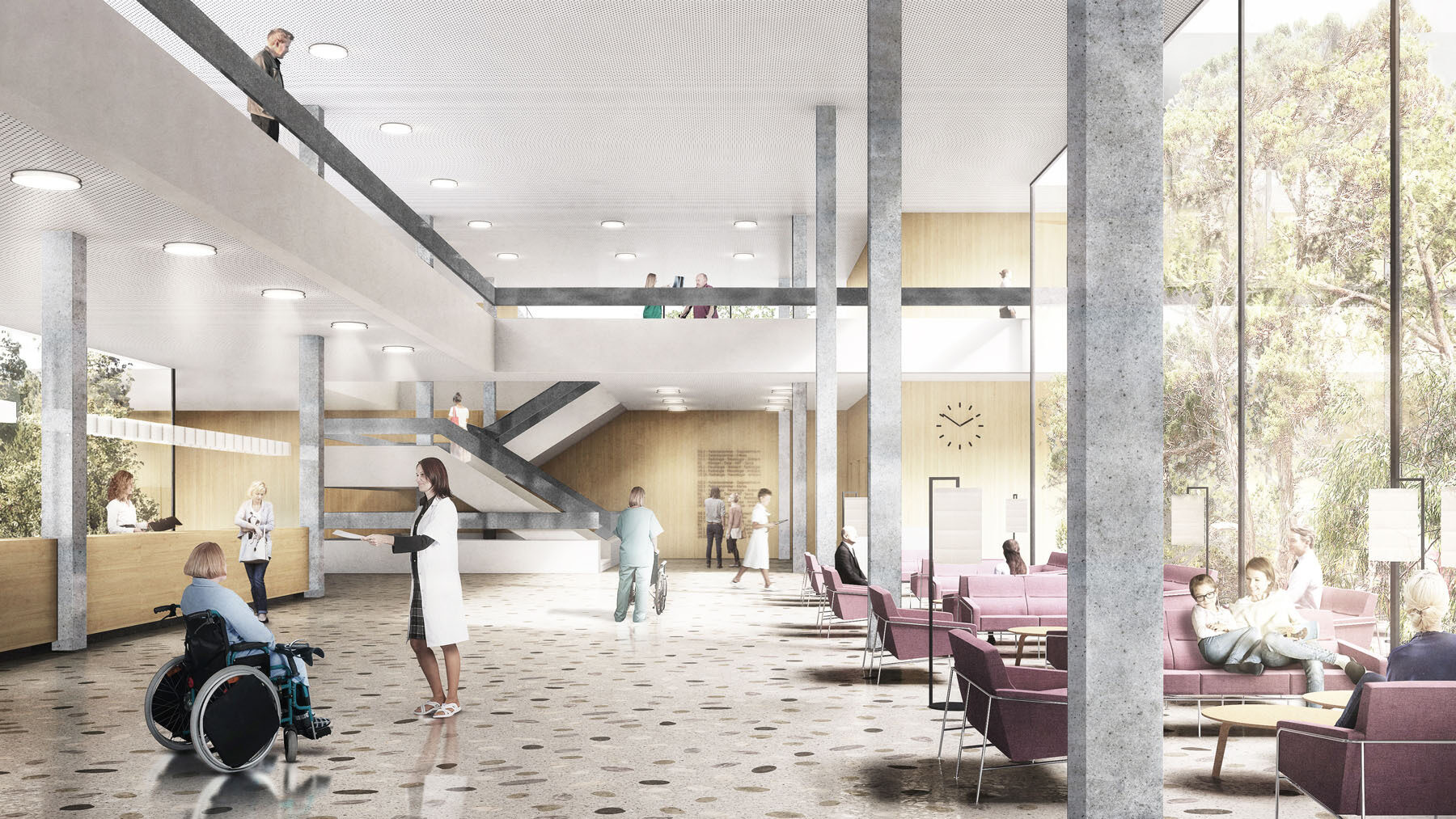 Drei grosszügige, bepflanzte Lichthöfe bringen viel Tageslicht ins Zentrum des insgesamt siebengeschossigen Gebäudes. Im Schnitt durchstossen sie das Gebäude bis in die Untergeschosse. Im Erdgeschoss schaffen die Höfe interessante Blickbeziehungen quer durch das Gebäude. Der Anmeldung und dem Wartebereich verleihen sie eine einzigartige Raumstimmung. Zudem ermöglicht der südliche Hof den direkten Blickbezug zum Restaurant, das an der Südseite des Gebäudes mit einer Terrasse zum Park angeordnet ist. Nebst der angenehmen Raumatmosphäre ermöglichen die Höfe auch eine optimale Orientierung für die Besucherinnen sowie das Personal.