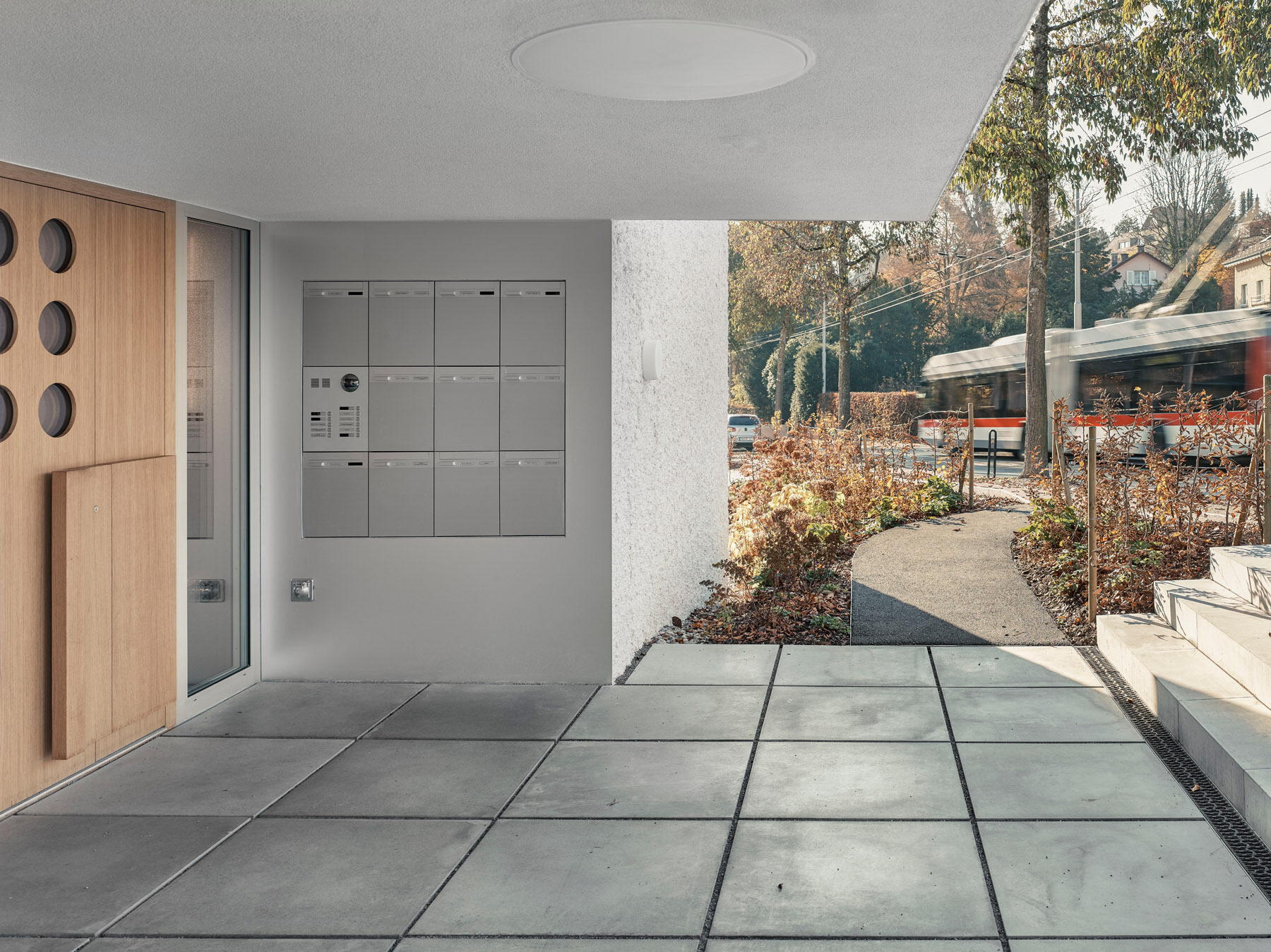 Der Heckenkörper, der die Strasse beidseitig begleitet, wird weitergeführt und ist ein wichtiger Bestandteil des Projektes. Die raumbildende Hecke wird nur im Bereich der Garageneinfahrt und des Gebäudezugangs unterbrochen. Im Gegensatz zur Strassenseite tritt das Gebäude stadtseitig als stattliche Villa in Erscheinung. Horizontale und vertikale Balkonelemente gliedern die lange Fassade. Seinen charakteristischen Ausdruck entwickelt das Haus durch die turmartige Ausformulierung der Rundbalkone und die lokal auf die Fassadenebene hervorspringende Attika. Zuoberst setzt die Windfahne einen spielerischen Akzent.