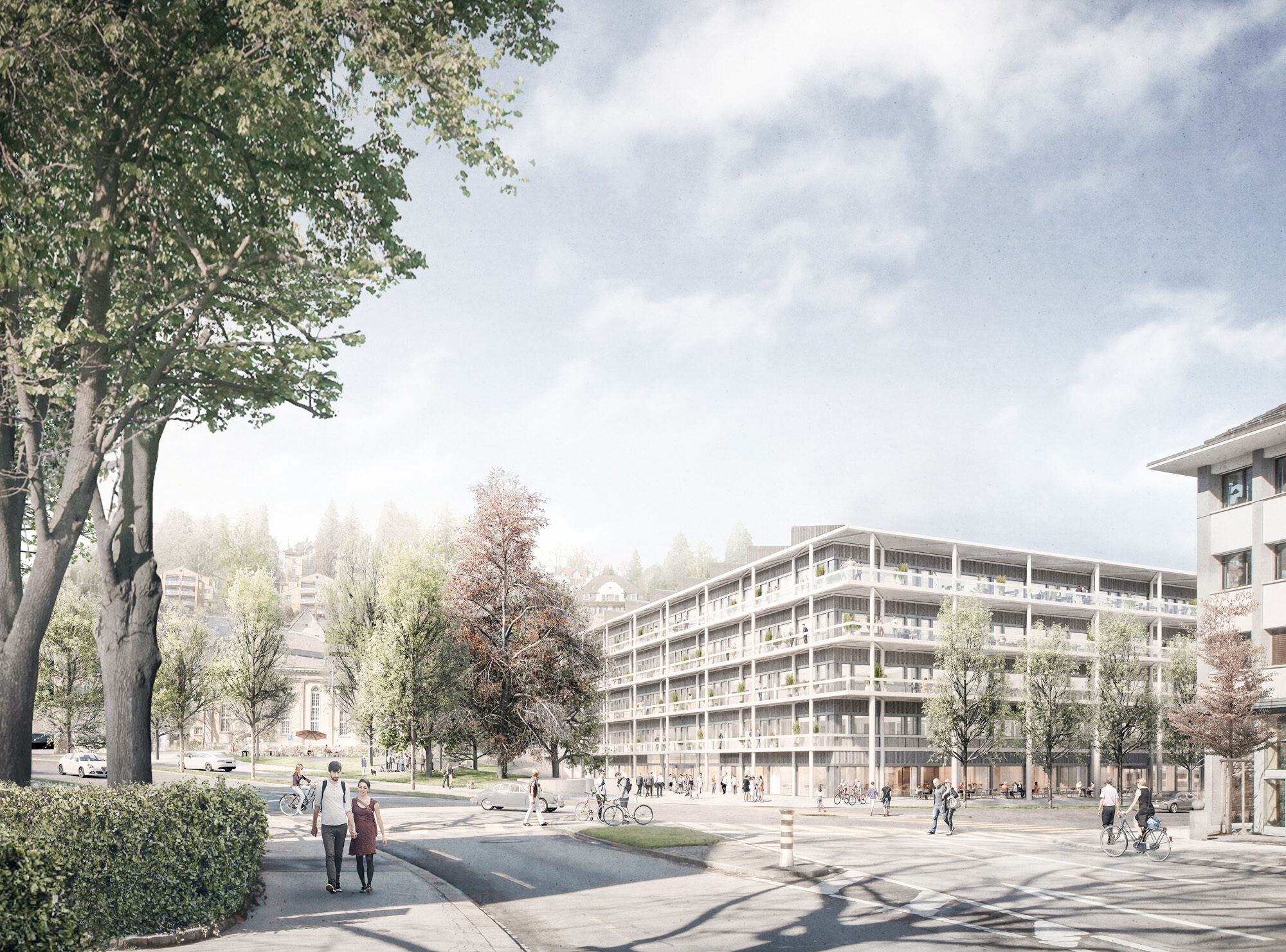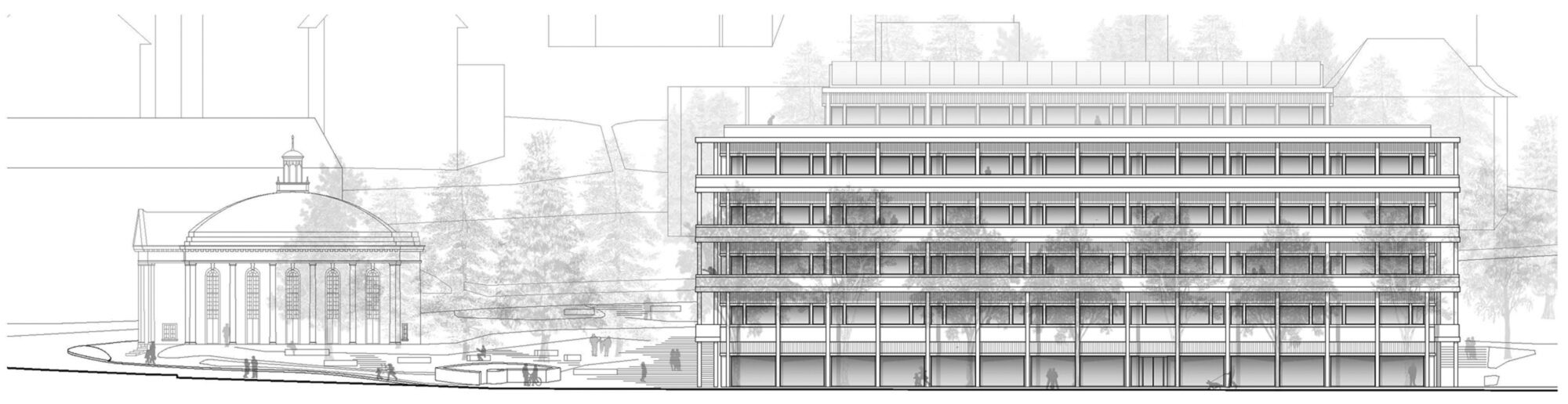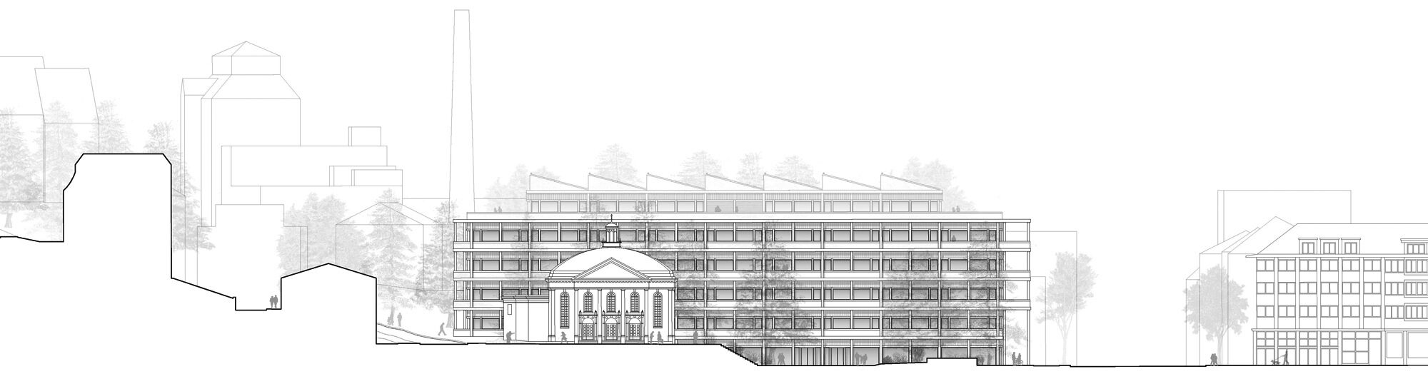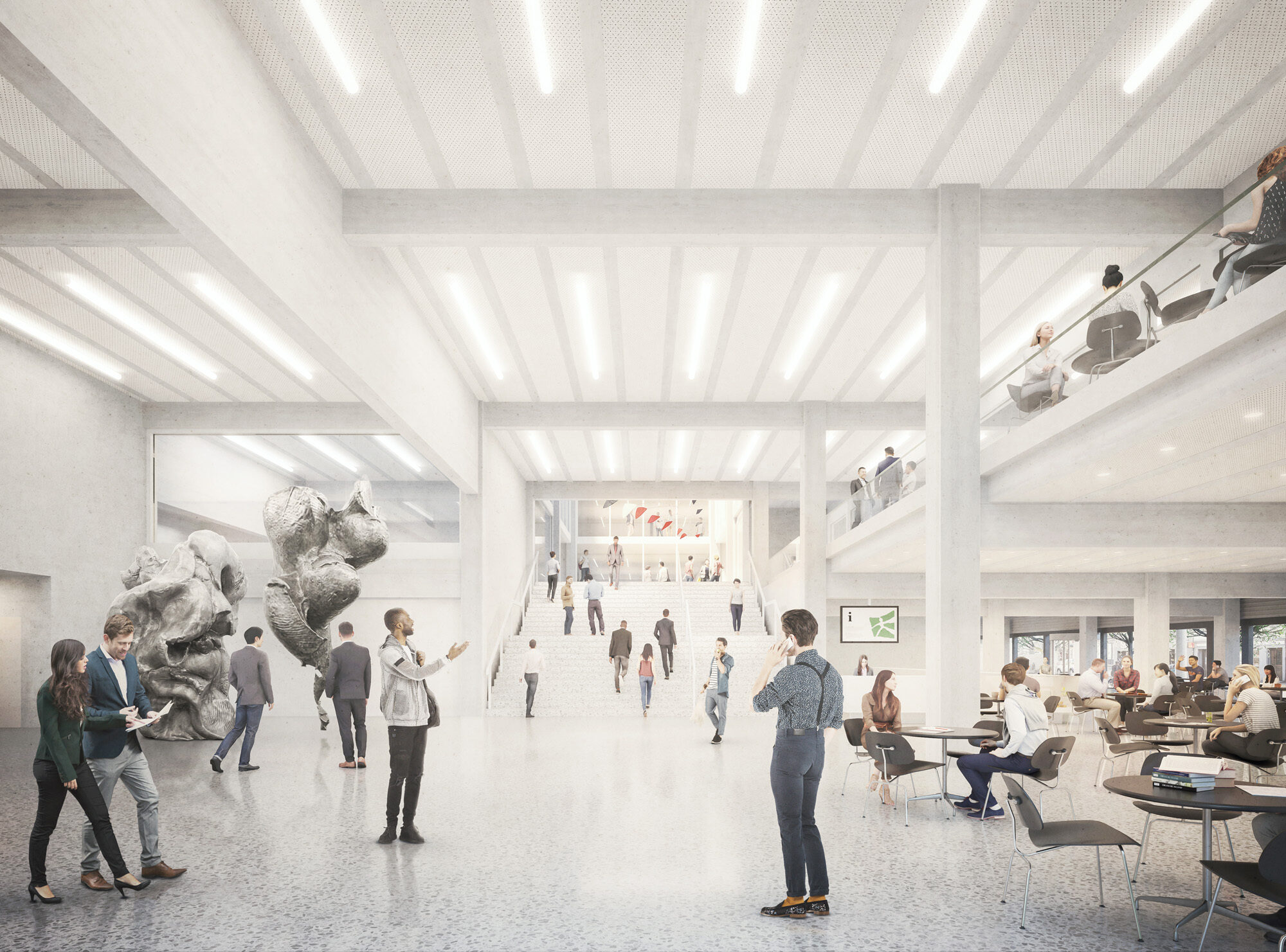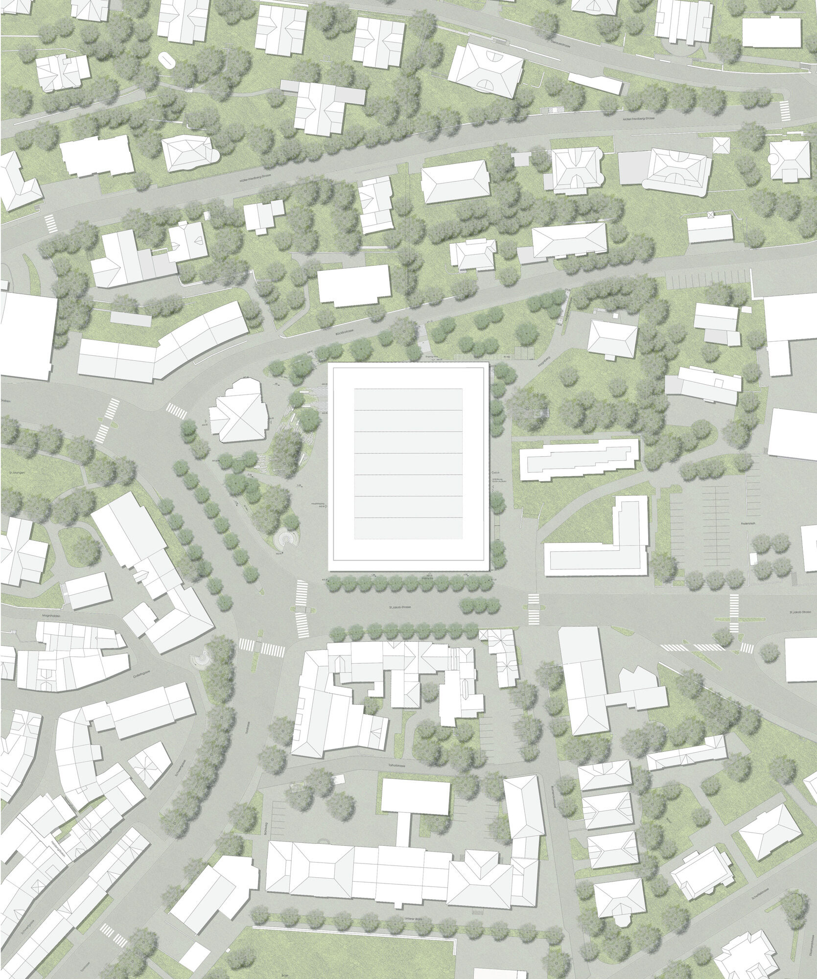 The university building on the new Platztor site forms the entrance to the other buildings of the campus along the Rosenberg, representing the renowned HSG in the centre of the city. The prominent solitaire building stretches from the St Jakob-Strasse to Böcklinstrasse and brings together the varied uses in one compact cubic volume. Its open facade and restaurants housed in the ground floor invite city dwellers and passers-by to partake in campus life. An adjacent square forms the entrance to the campus and connects the space of the Old Town with the new buildings. Like other public buildings in Saint Gallen, such as the theatre or the museums in the City Park, this campus also possesses a generous green space. The existing open church forms a further point of identification, and houses a public-oriented use in the in the area of gastronomy or culture. More