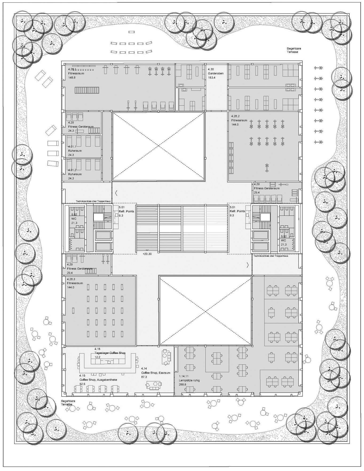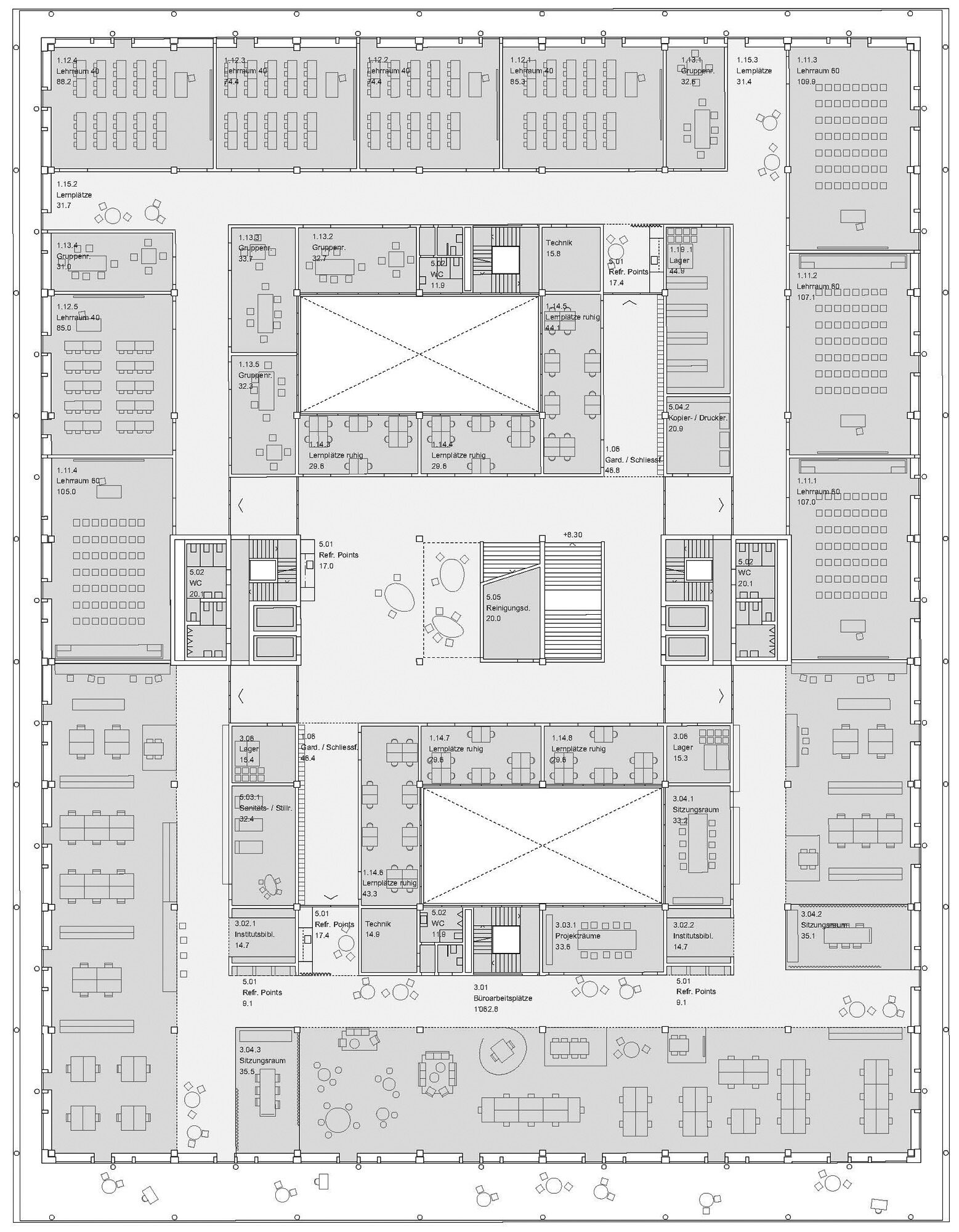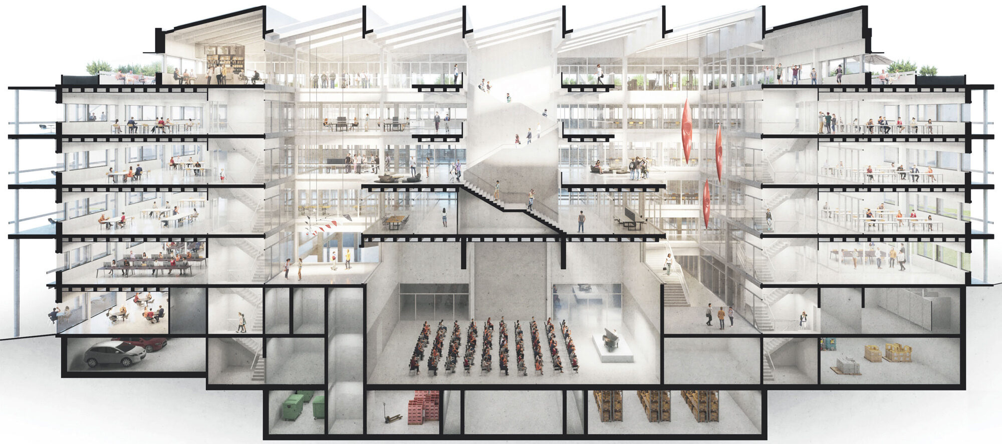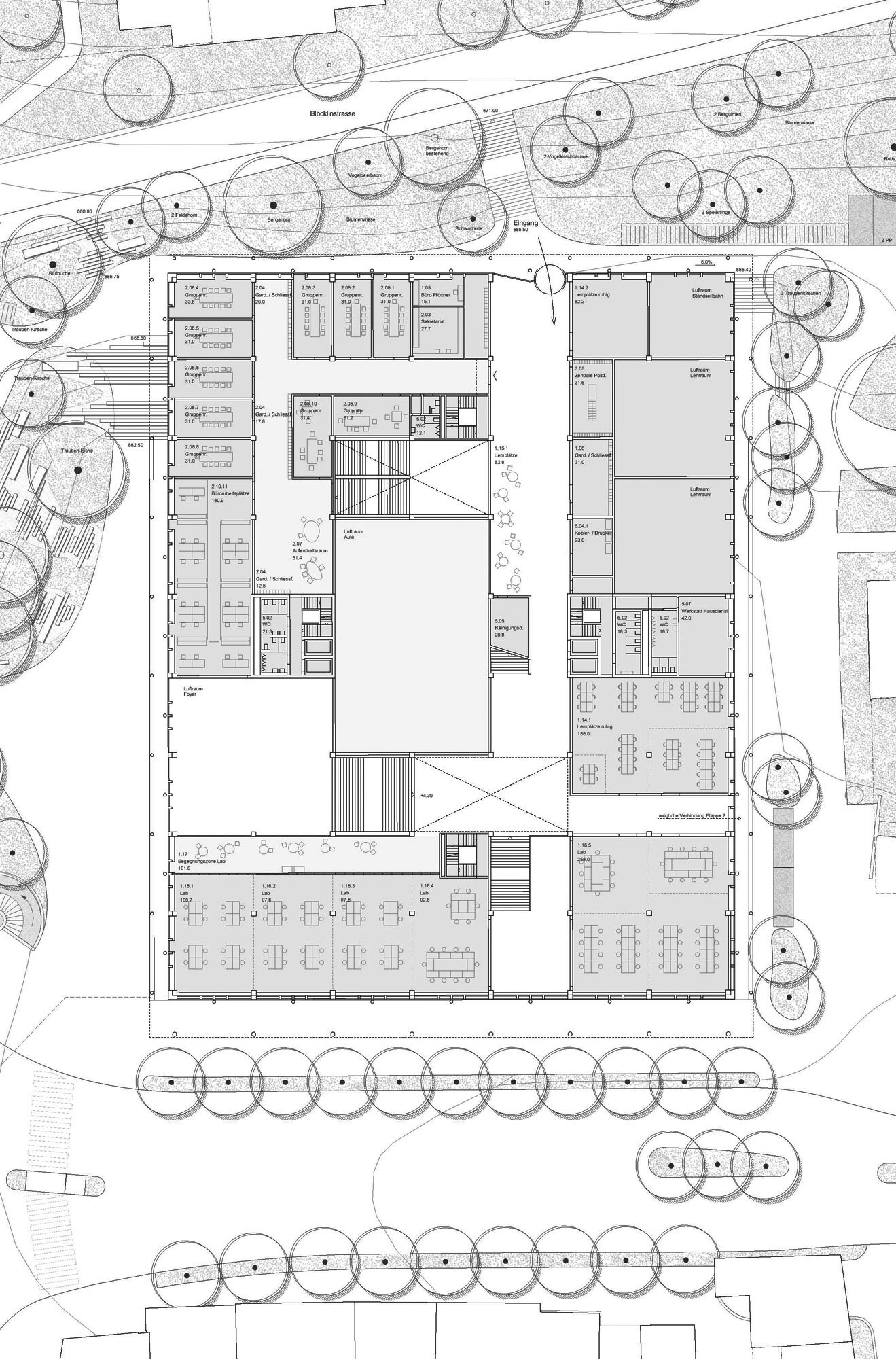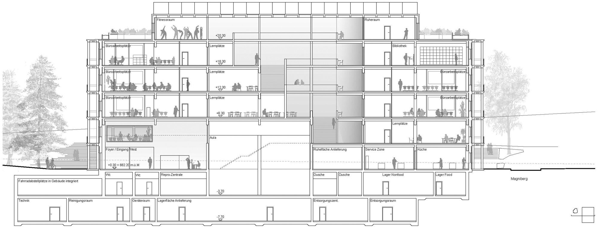 Visitors and students alike enter a generous foyer via the main entrance on the square, in which one finds areas for sitting and waiting as well as an adjacent Food Corner. A large staircase leads downwards along the facade, where the foyer continues to the hall in the middle of the building. Because of its situation on the hillside, the building has two entrance levels. The secondary entrances in the north and the south join these together and form principal passageway on the first floor. From here a cascade staircase leads to the floors above which consists of two parts: on the side towards St Jakob-Strasse open-plan office spaces for research, and on the other side, more intimates spaces are arranged for teaching. In the middle of the building the two areas blend into each other. Between the two atriums unfolds a generous circulation space with adjacent break areas where spontaneous encounters and informal conversations can take place. The building is capped off by a roof storey which, thanks to its generous spaces, has a public character. Alongside teaching, this floor serves as somewhere to socialise, relax and exercise. Here, one finds a coffee shop as well as different gym spaces which profit from natural light through a shed roof and a terrace which runs around the entire building. Alongside its compact volume and timber structure, the design of the roof makes an important contribution to the sustainable operation of the building. On the pitched surfaces of the shed roof a photovoltaic array is installed and the exterior surfaces of the terraces are intensively planted.