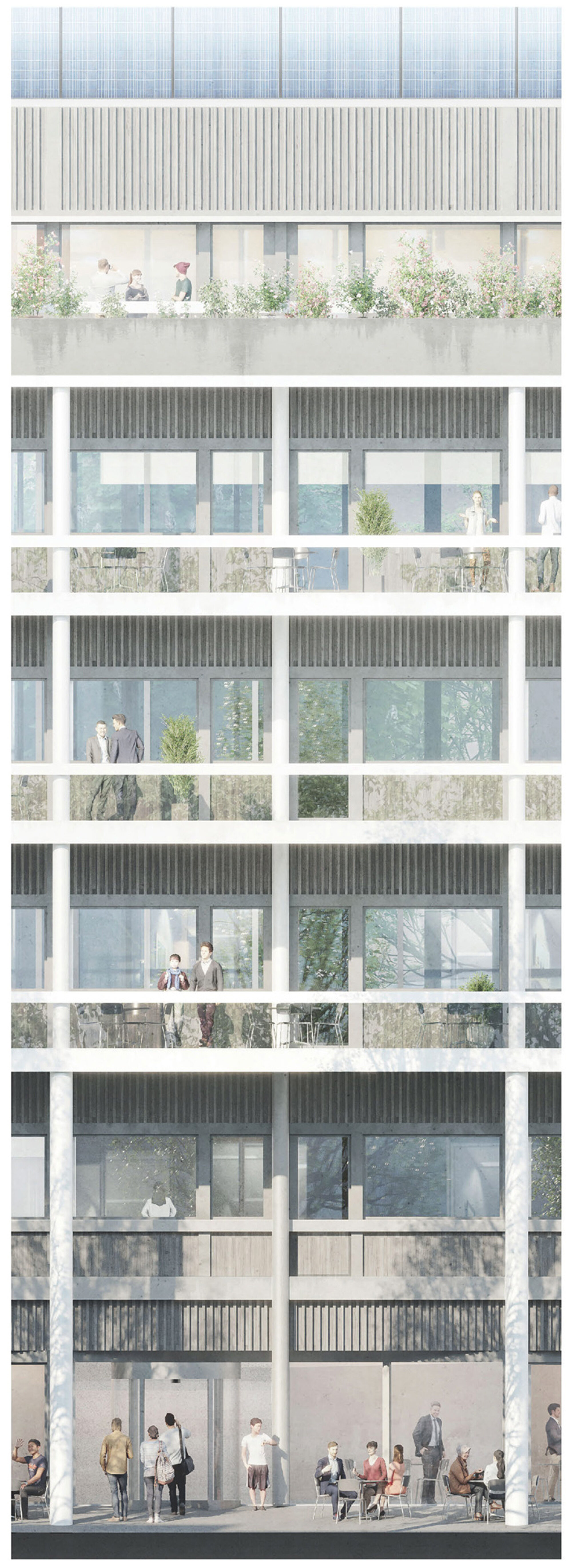 Continuing the arcades along St Jakob-Strasse, a spatial layer envelops the entire volume. The light white layer of balconies provides shade to the interior and serves as protection from noise and the elements. At the same time, this external layer of the building brought to life by the by the users creating a strong impression towards the Platztor campus, underlining its public character.