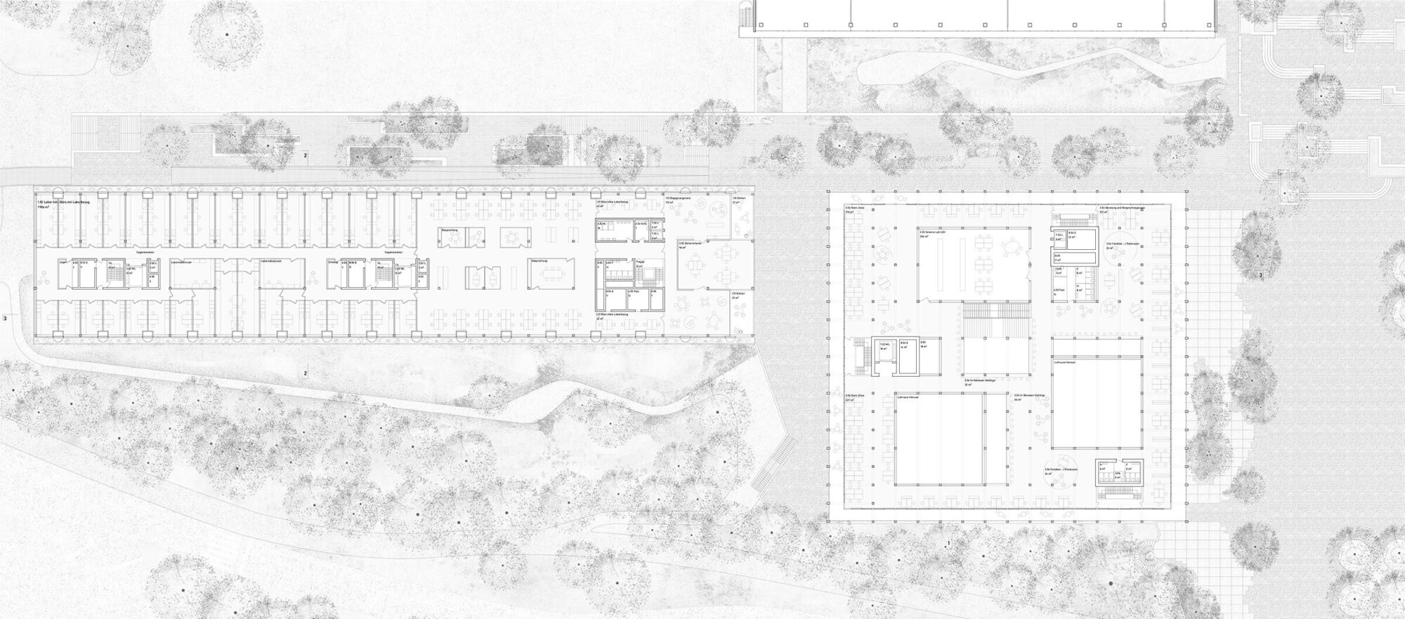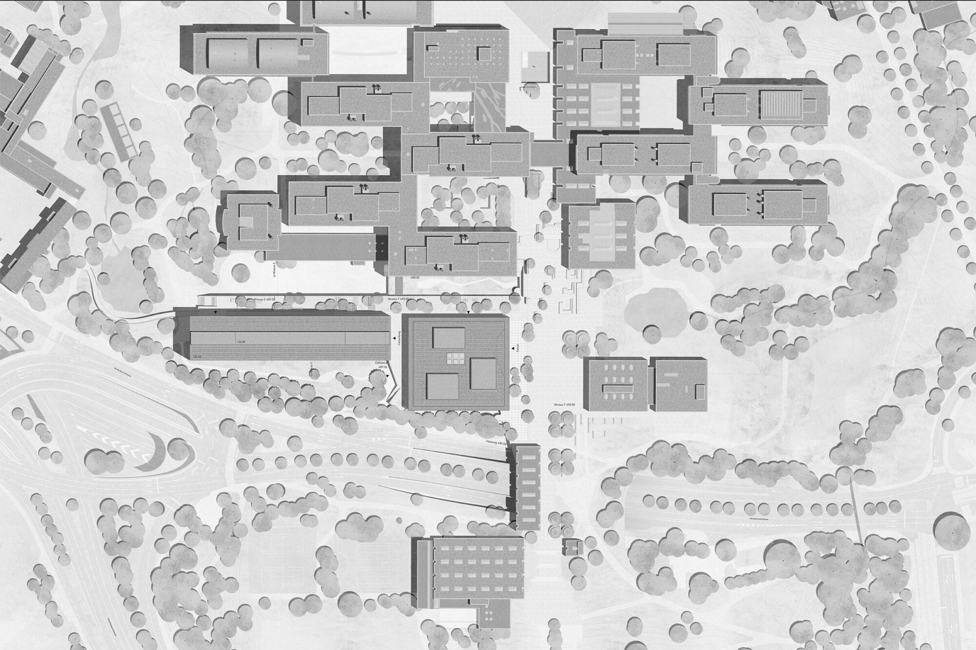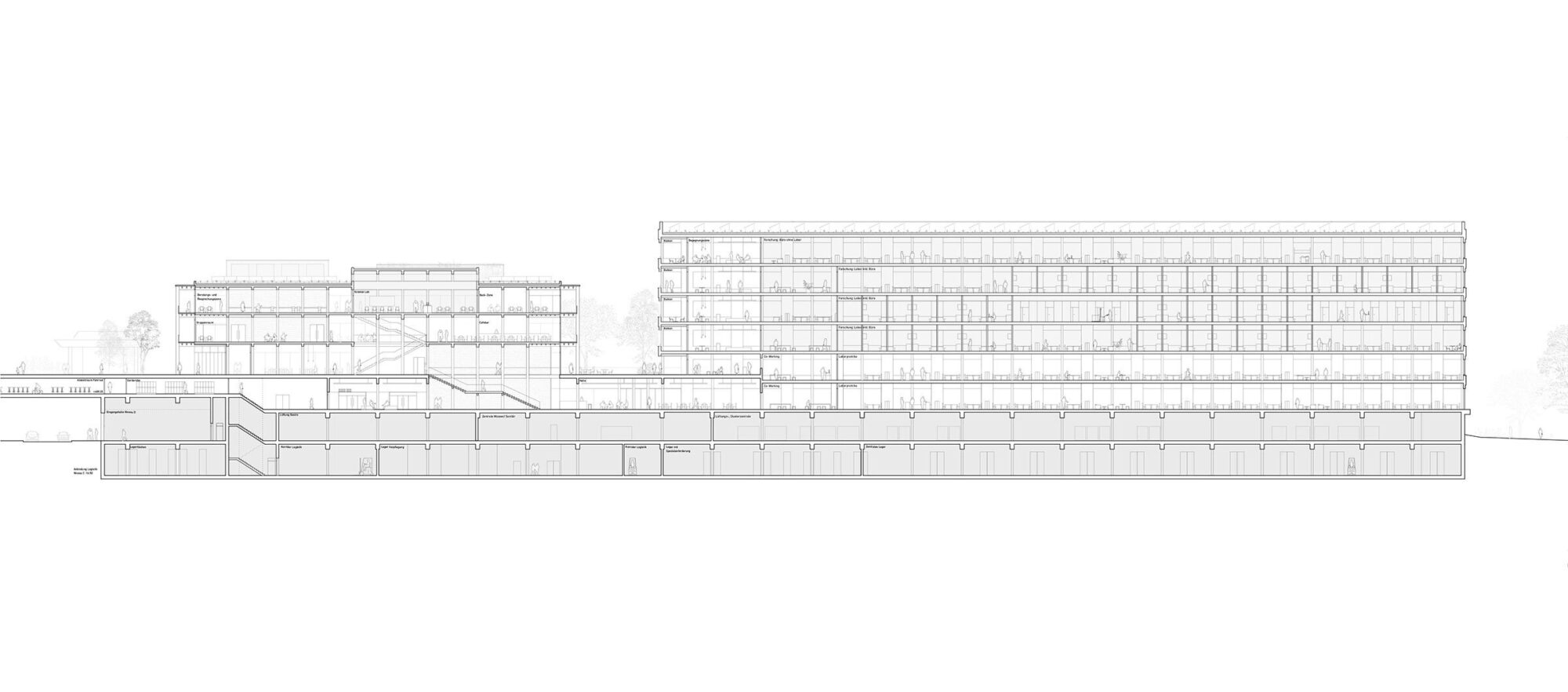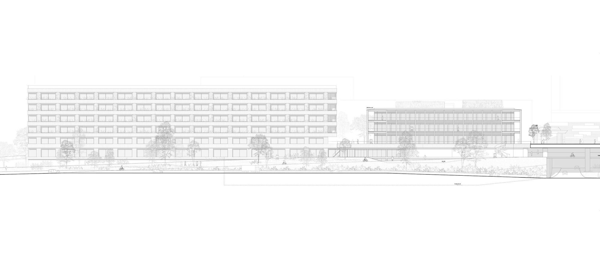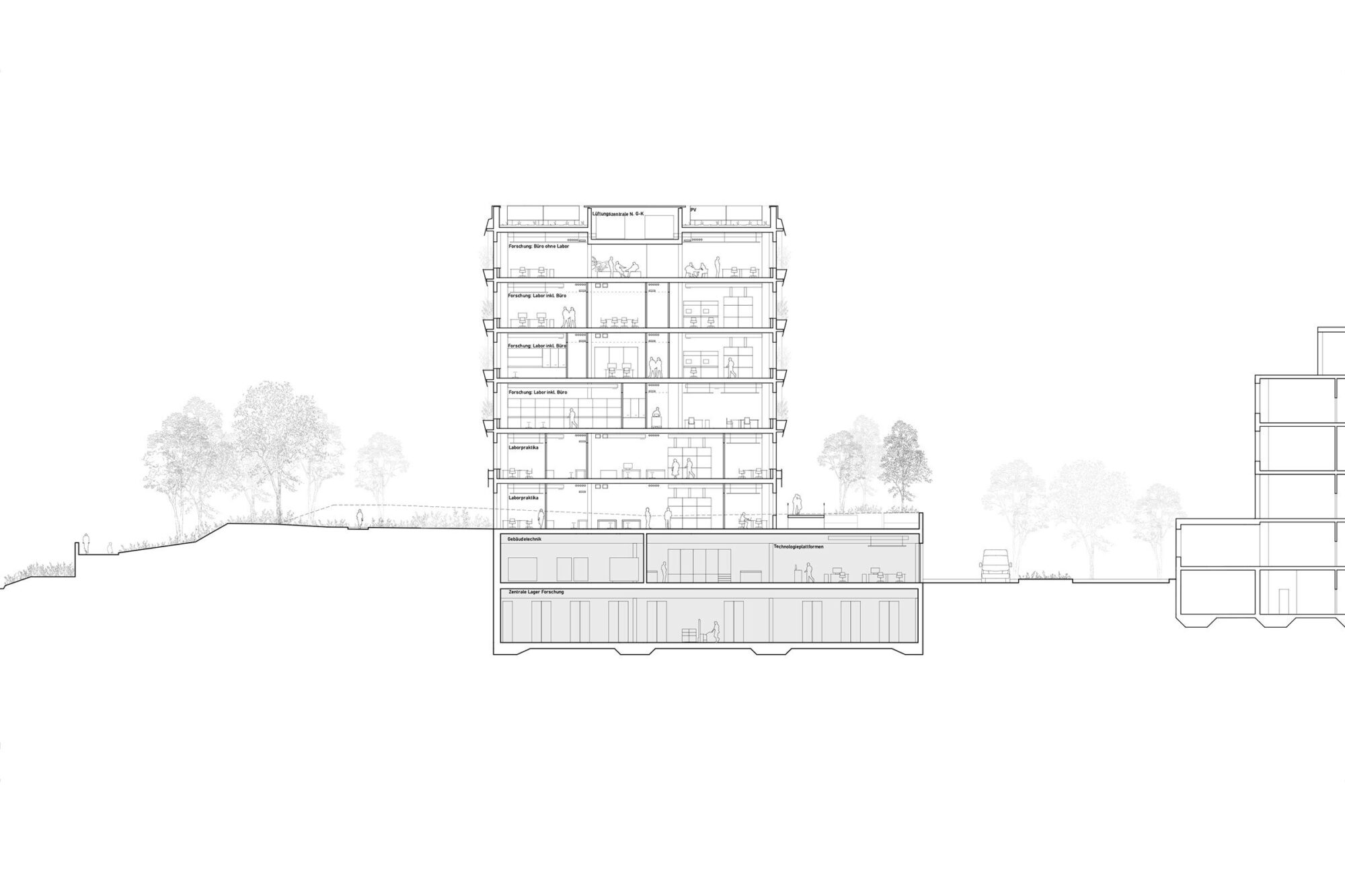The project proposes a composition of two buildings, very different in their proportions and architectural expression. Oriented on the overall proposals of the earlier feasibility studies, it proposes splitting the programme for research and teaching into two volumes, which relates to the scale of the surrounding buildings. The new buildings Y10 and Y51 form the lower edge of the site towards Kantonstrasse. Because of its situation and its public role, the almost square building Y10 serves as a point of orientation and an address for the campus as a whole. Towards the promenade, it appears as a three-storey building, establishing a strong counterpart to the State Archives building. It forms a contrast to the long forms of the existing pattern of buildings. Despite its peripheral situation, one finds here the future centre of a structuralist campus originally built without a centre. Its counterpart is made by the elongated laboratory building Y51. More