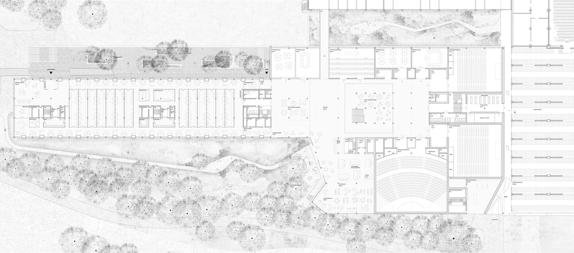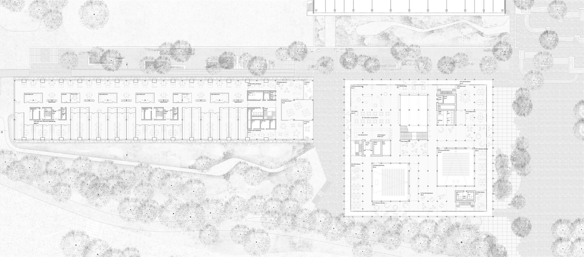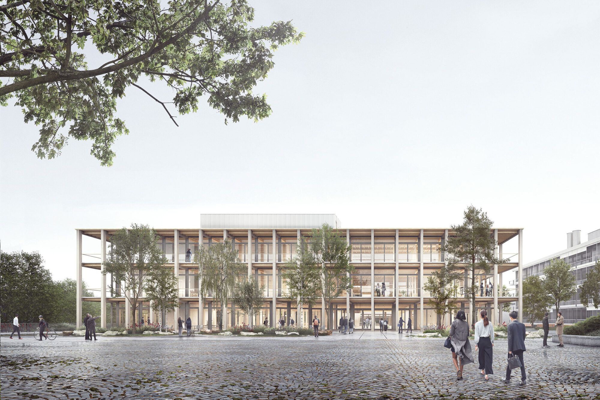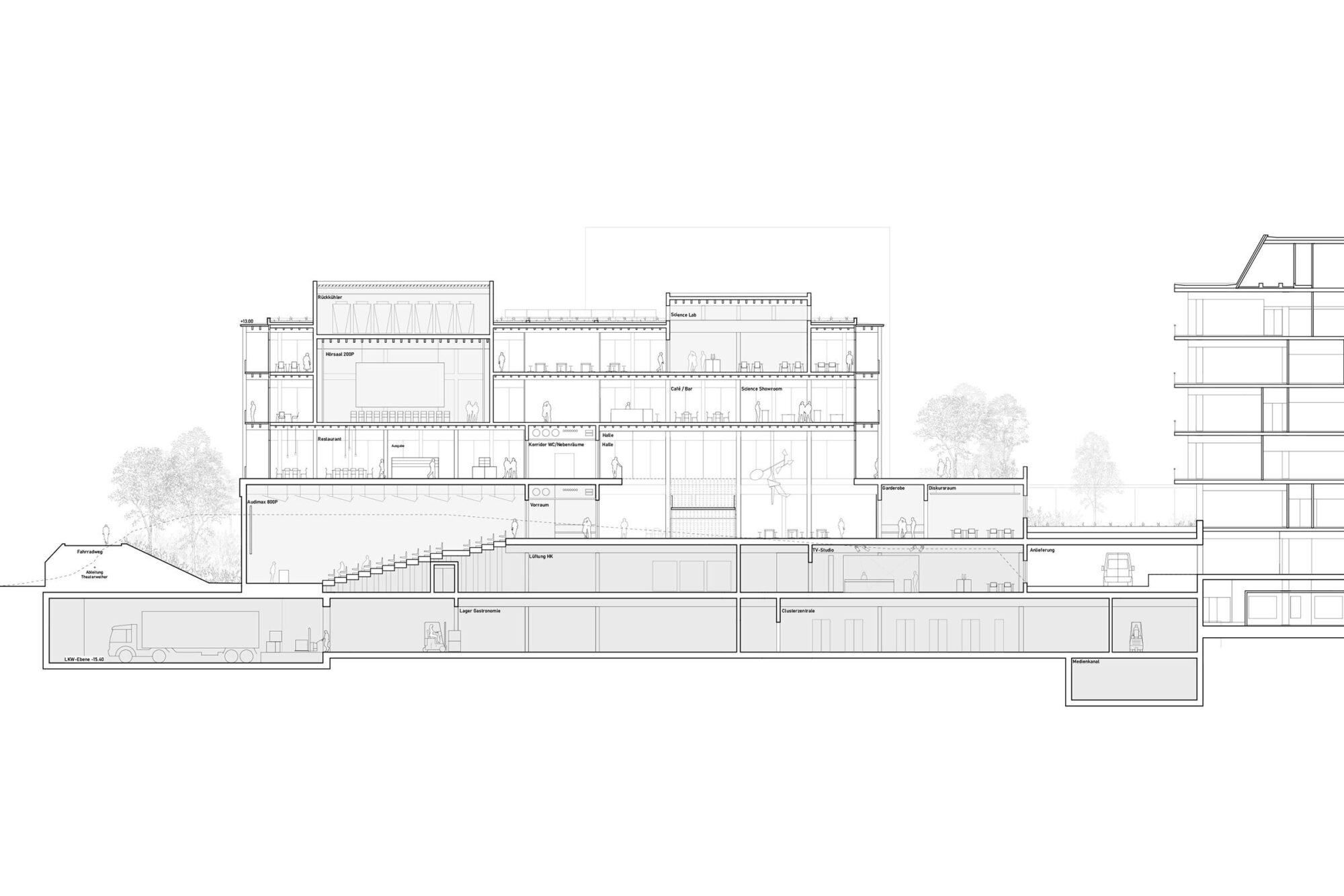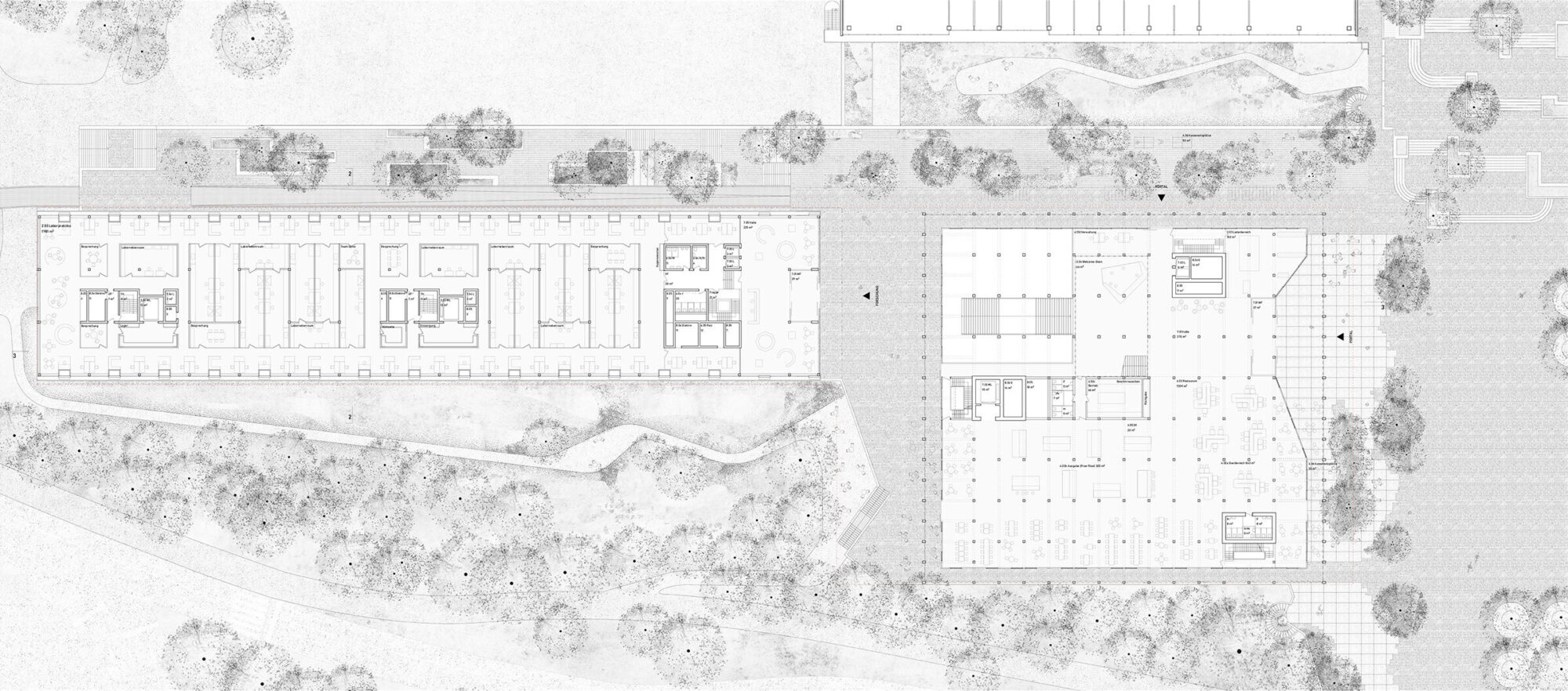 The project proposes a composition of two buildings, very different in their proportions and architectural expression. Oriented on the overall proposals of the earlier feasibility studies, it proposes splitting the programme for research and teaching into two volumes, which relates to the scale of the surrounding buildings. The new buildings Y10 and Y51 form the lower edge of the site towards Kantonstrasse. Because of its situation and its public role, the almost square building Y10 serves as a point of orientation and an address for the campus as a whole. Towards the promenade, it appears as a three-storey building, establishing a strong counterpart to the State Archives building. It forms a contrast to the long forms of the existing pattern of buildings. Despite its peripheral situation, one finds here the future centre of a structuralist campus originally built without a centre. Its counterpart is made by the elongated laboratory building Y51. More