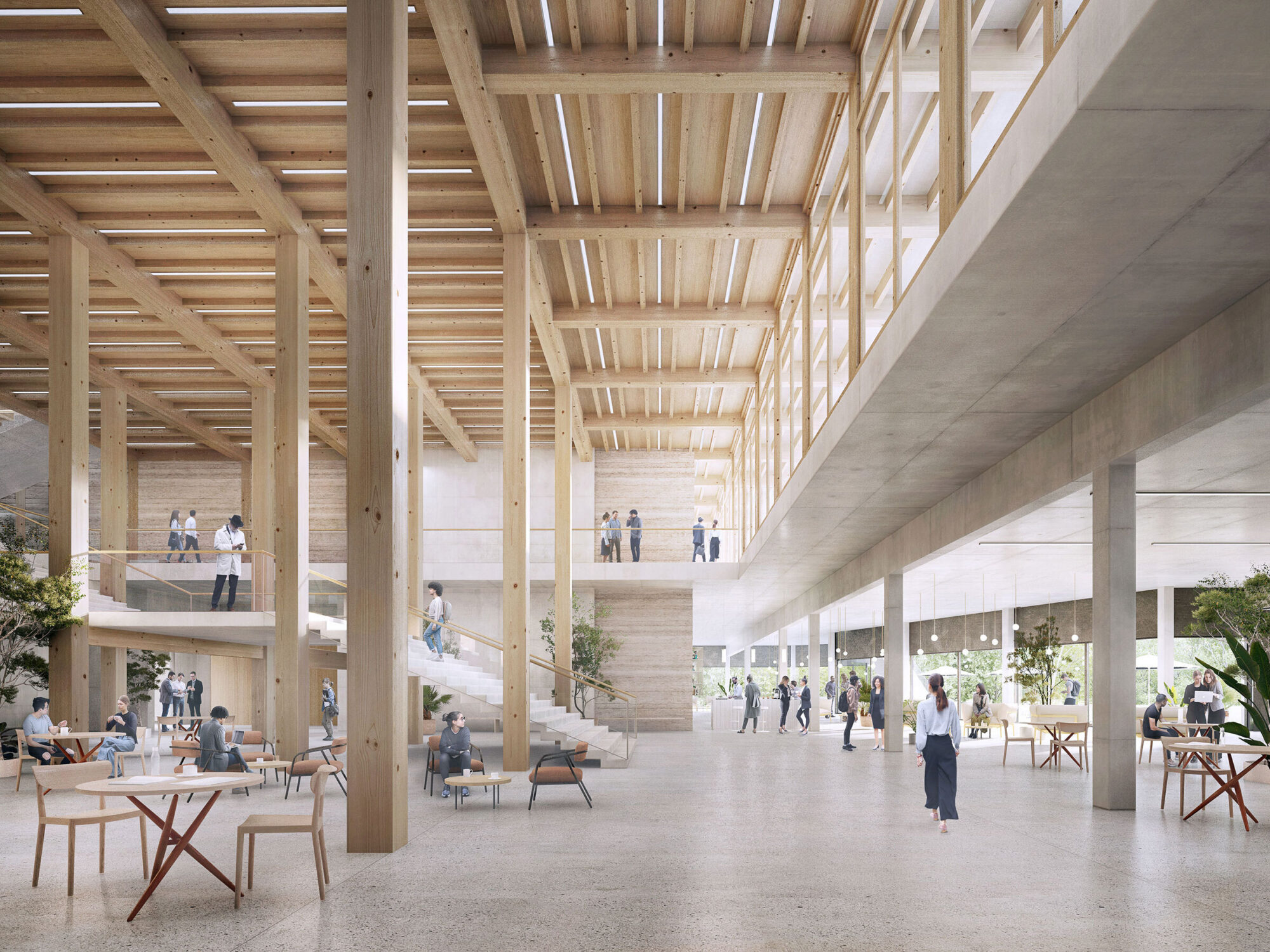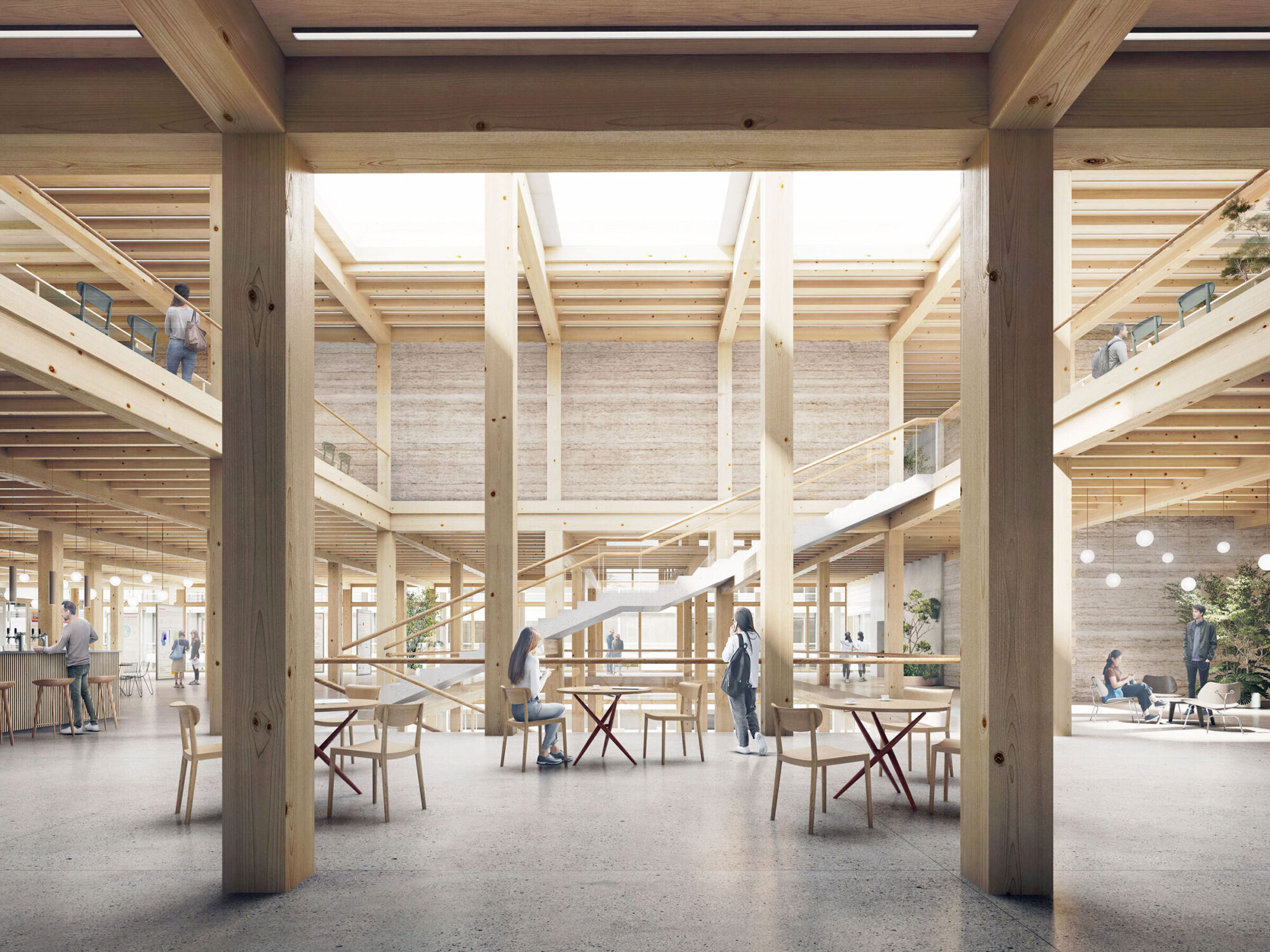 The way the two buildings differ is also shown in their architectural expression. A common concrete socle forms a basis and takes up the differences in topography. The tectonic order established here continues over the upper floors of the laboratory building Y51, where continuous, planted spandrels alternating with ribbon windows emphasise the horizontal appearance of the building. In contrast, the pavilion-like teaching building Y10, whose deep facade gives the building a light and open appearance. Its upper storeys have balconies all around, which form a transitional space that can also be used to relax and study. The timber structure orders the three-storey facades, with the tall, multi-storey columns giving a vertical emphasis. Together, the two buildings make a pair, which determine and strengthen one another, while each still having its own unique character.