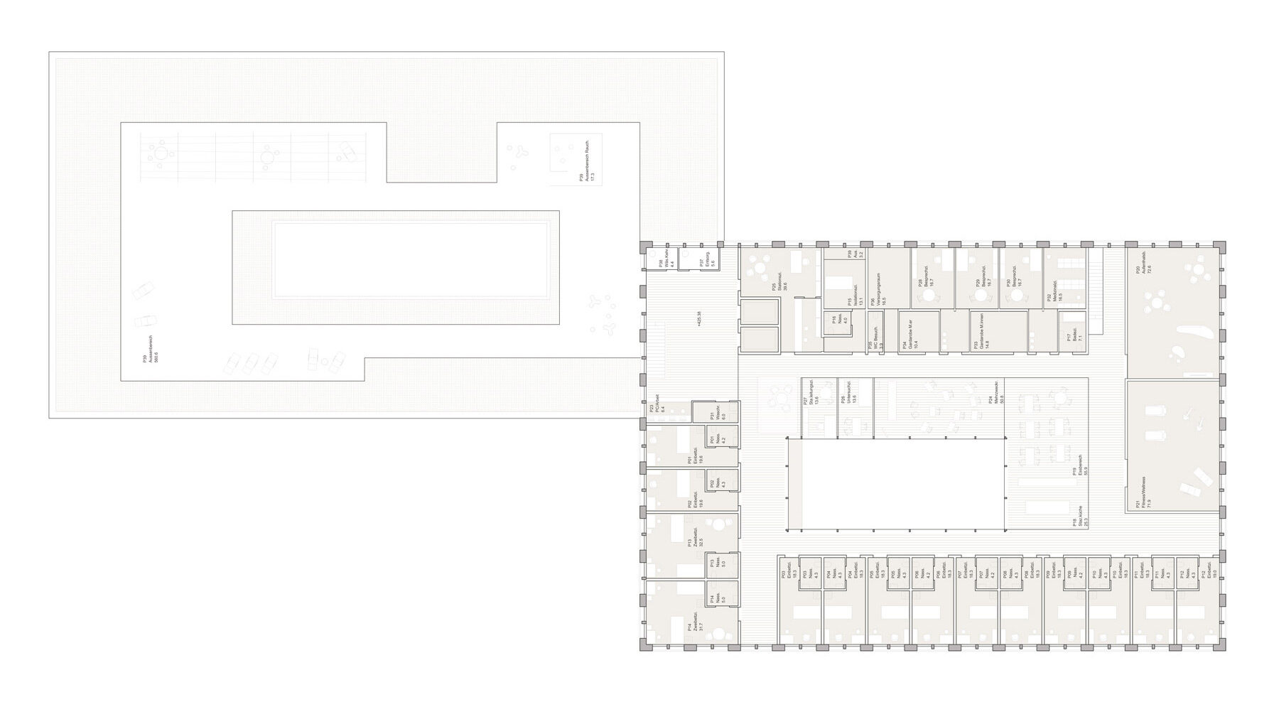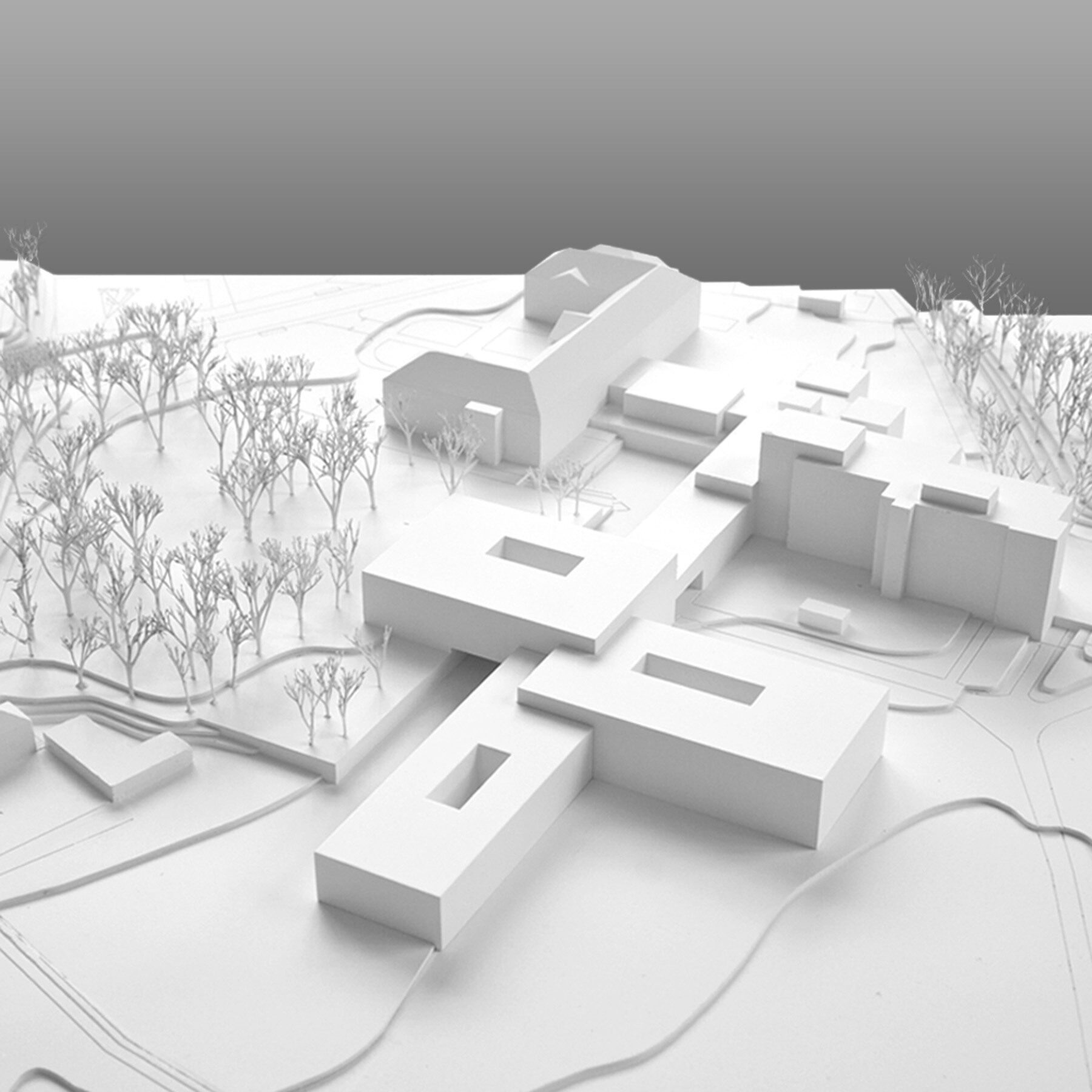 In the first stage, the two buildings facing east and west will be built. For the future expansion, the proposed composition allows for various possibilities: On the one hand, a repetition of the two buildings in an east-west direction along the main axis is possible. On the other hand, as suggested in the site plan, a block could be connected to the north of the central building core.