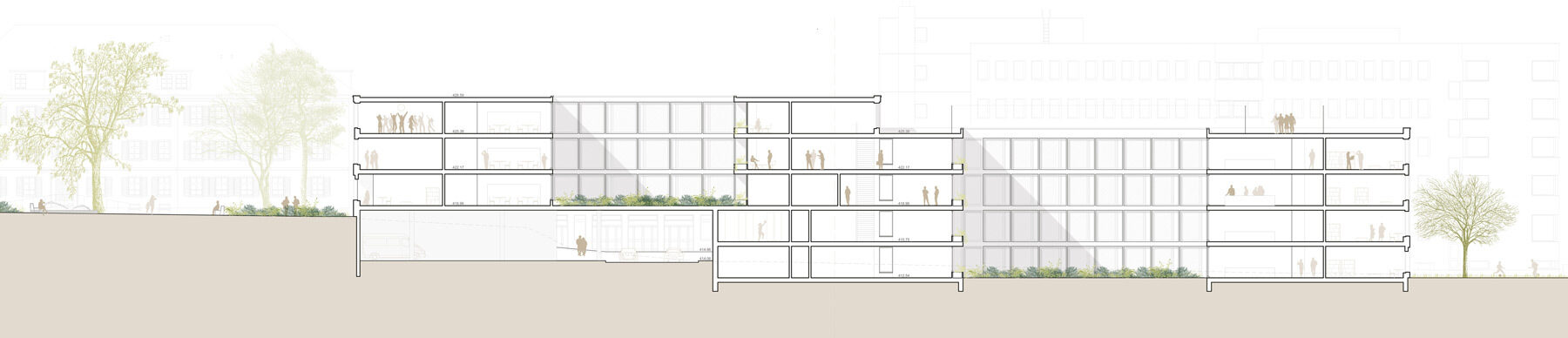 The existing landscape provides an excellent setting for the new building. It is easily accessible on foot through the historic gardens, where a side entrance for visitors and staff is planned. The reception, an open and transparent volume, is located in the connecting section. The staircase is the centrepiece of the new building, connecting the wards and generating a pinwheel circulation that is transferred to the ward floor plans. The visual relationships created by this to the outside space enable good internal orientation. The functional rooms are integrated in the core of the building.