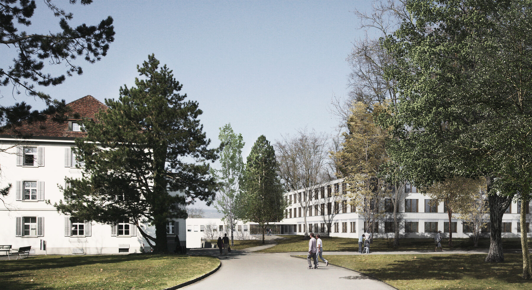 The Schlosstal Psychiatric Clinic is located in the landscape park on the River Töss – a local recreation area characterised by historic industries. The industrial monument of the former Beugger spinning mill forms the prelude to the current clinic complex. The new building is planned along the main axis of the extension and completes the ensemble. The nine wards are organised in three buildings that differ in proportions and orientation. The staggering of the volume supports the good integration into the landscape. A central core, hidden in the volumetric overlap, serves all the new stations. Short and safe routes guarantee an efficient organisation of daily processes. More