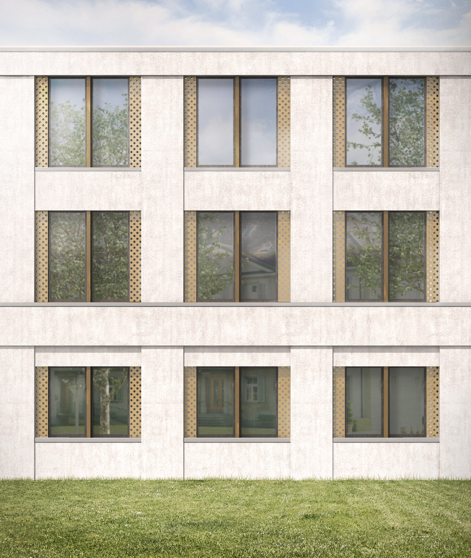 The new building interprets the appearance of the historic spinning mill, with its perforated facade. Its facade is divided into a plinth, a two-storey body and the roof fascia. The latter respects the ridge line of the historic facade.