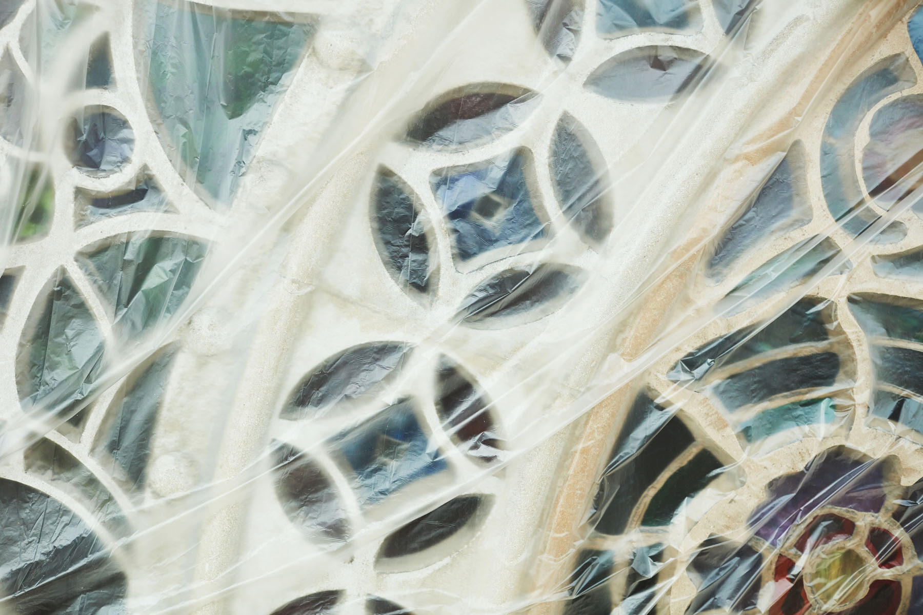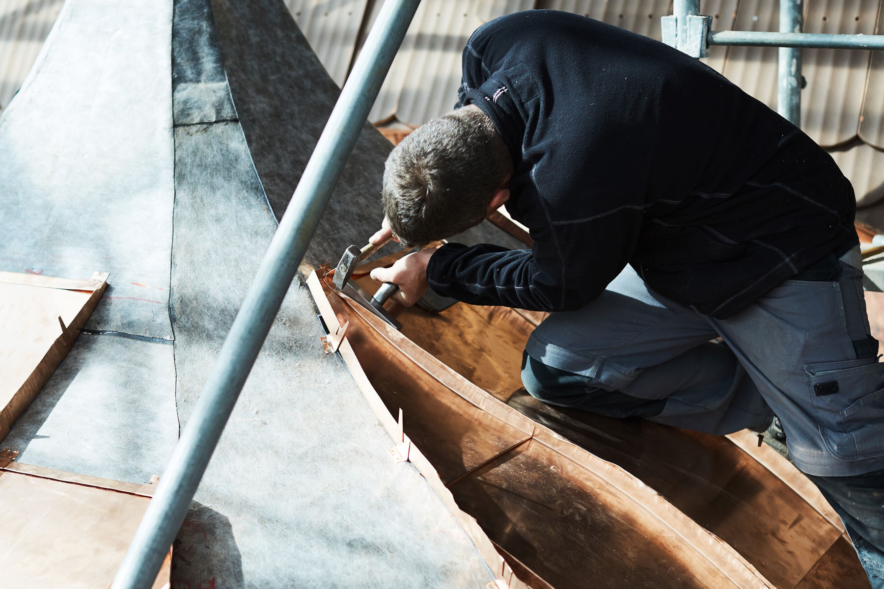 Broken and leaking copper sheeting was replaced, while intact copper elements were restored. From the sub-roof, a renewal of the entire roof structure and all its joints took place. The badly damaged tower spire was re-roofed. The numerous stone elements were thoroughly cleaned, and the concrete ribs of the large church windows were carefully repaired. Defective areas in the plaster were rebuilt. Afterwards, the entire facade was given a uniform coat of paint.