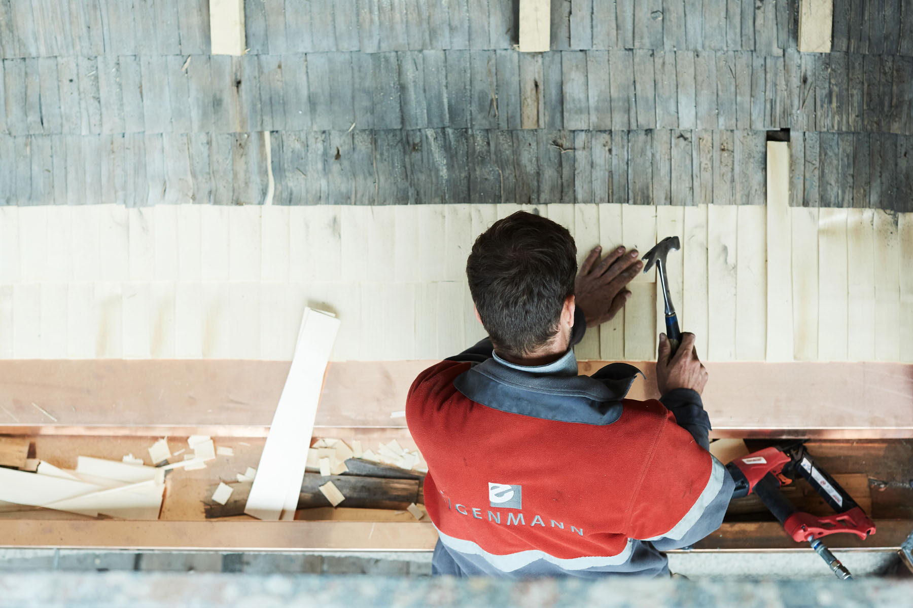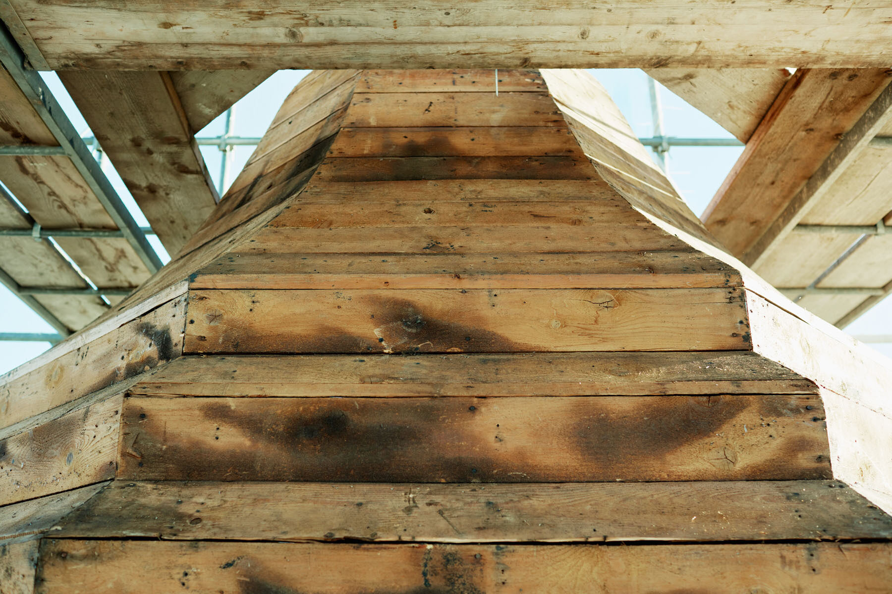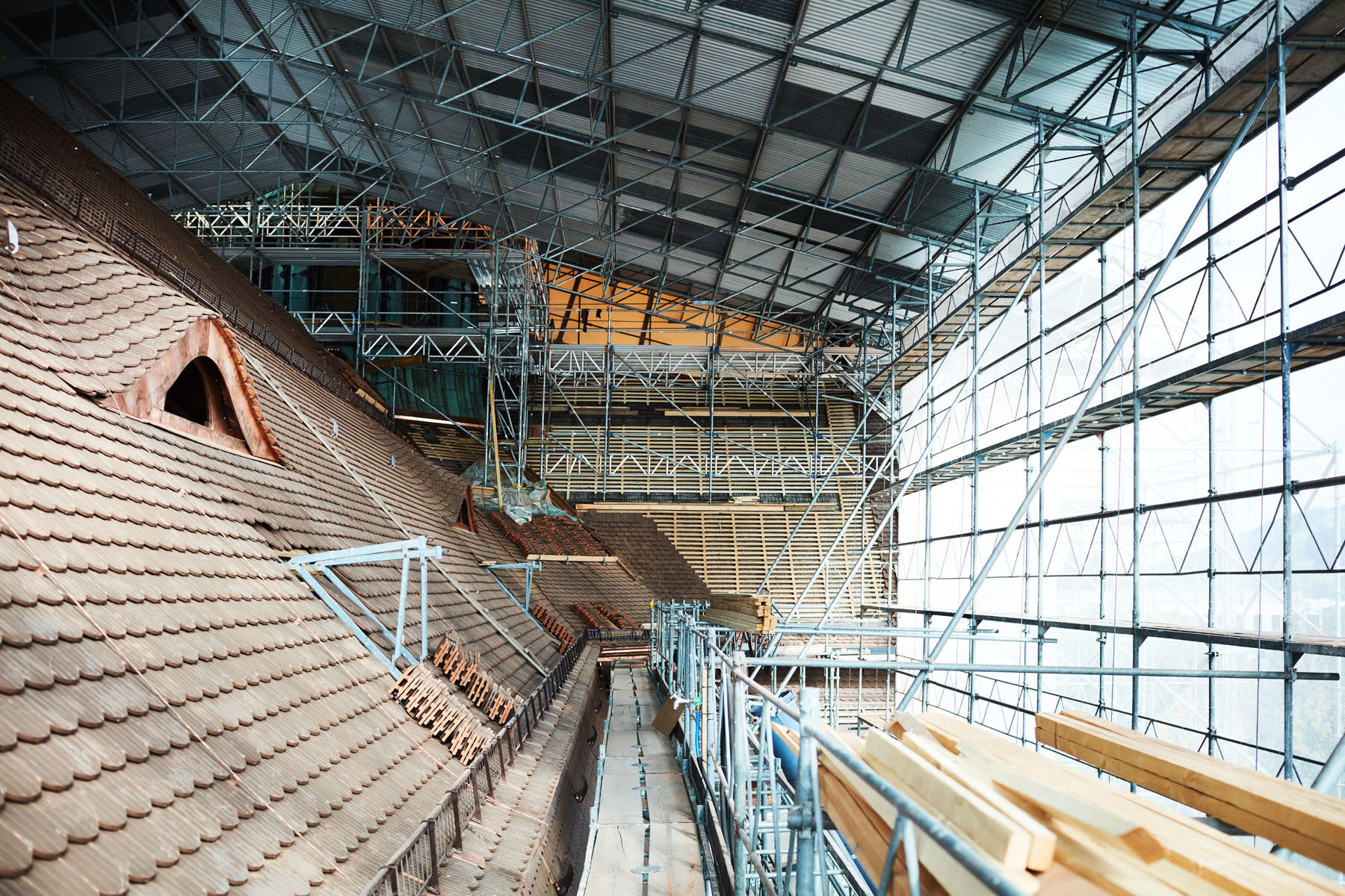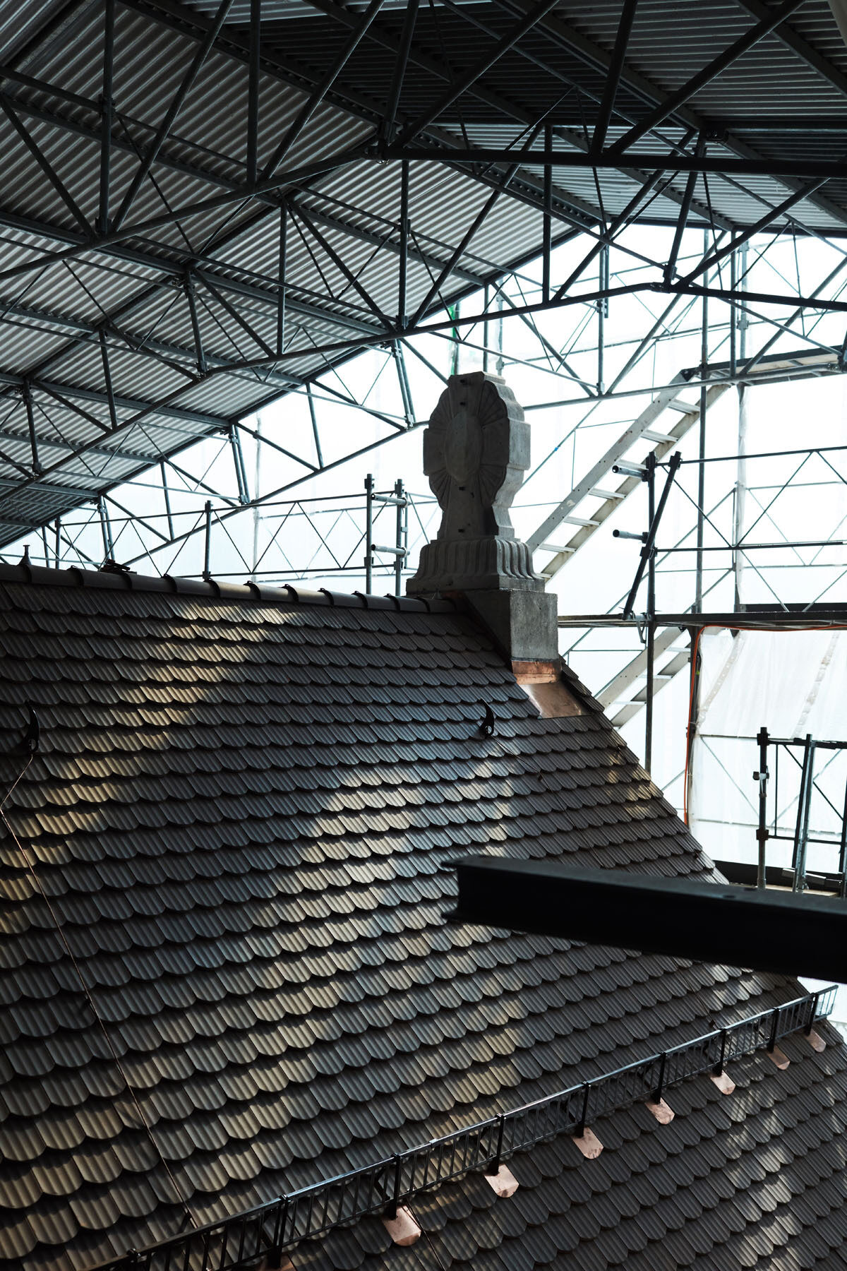 New tiles, modelled on the original, replaced the old, damaged tiles. A specially developed recipe for the project ensured that the tonality of the new roofing resembles that of the existing roof. In addition to flat tiles, convex and concave pieces were also produced in order to faithfully reproduce the existing roof details.
